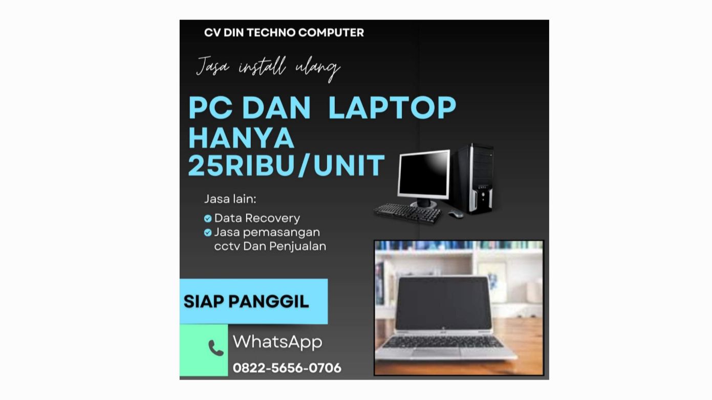“Ya, jasa install ulang PC dan laptop hanya Rp 25 ribu per unit, siap panggil, hubungi WA 082256560706,” Kata Owner Din Techno Computer, Tajudin Noor AK kepada posborneo.com, Kamis (9/5/2024).