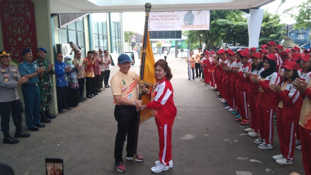 Sekda Kapuas, Septedy menyerahkan pataka lambang daerah kepada Kepala Disparbudpora, Apollonia saat pelepasan kontingen Selekda Pra Popnas di Halaman Rujab Bupati, Kamis (4/7/2024) pagi. POSBORNEO.COM...