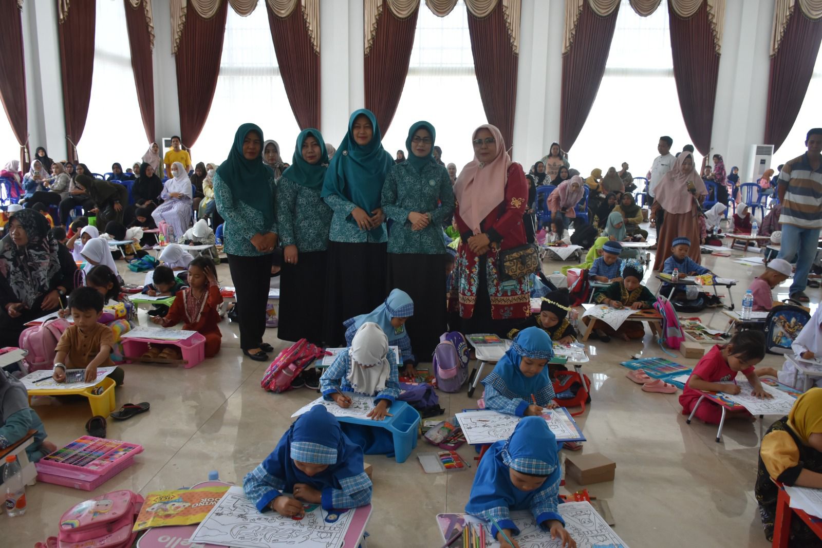 Pj Ketua TP PKK Kapuas Agustina Erlin Hardi saat melihat salah satu peserta yang mengikuti lomba mewarna tingkat Pelajar Kabupaten Kapuas tahun 2024, Minggu (28/4/2024) di Aula Rumah Jabatan Bupati Ka...