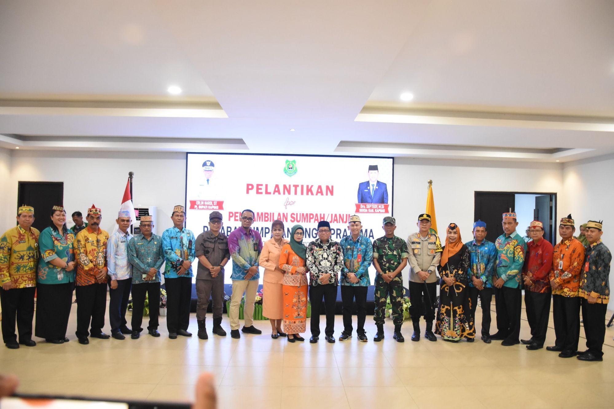 Pj Bupati Kapuas Erlin Hardi berfoto bersama usai melantik dan mengambil sumpah janji jabatan kepada 12 pejabat Pimpinan Tinggi Pratama di lingkup Pemkab Kapuas, bertempat di Aula Rumah Jabatan Bupati...