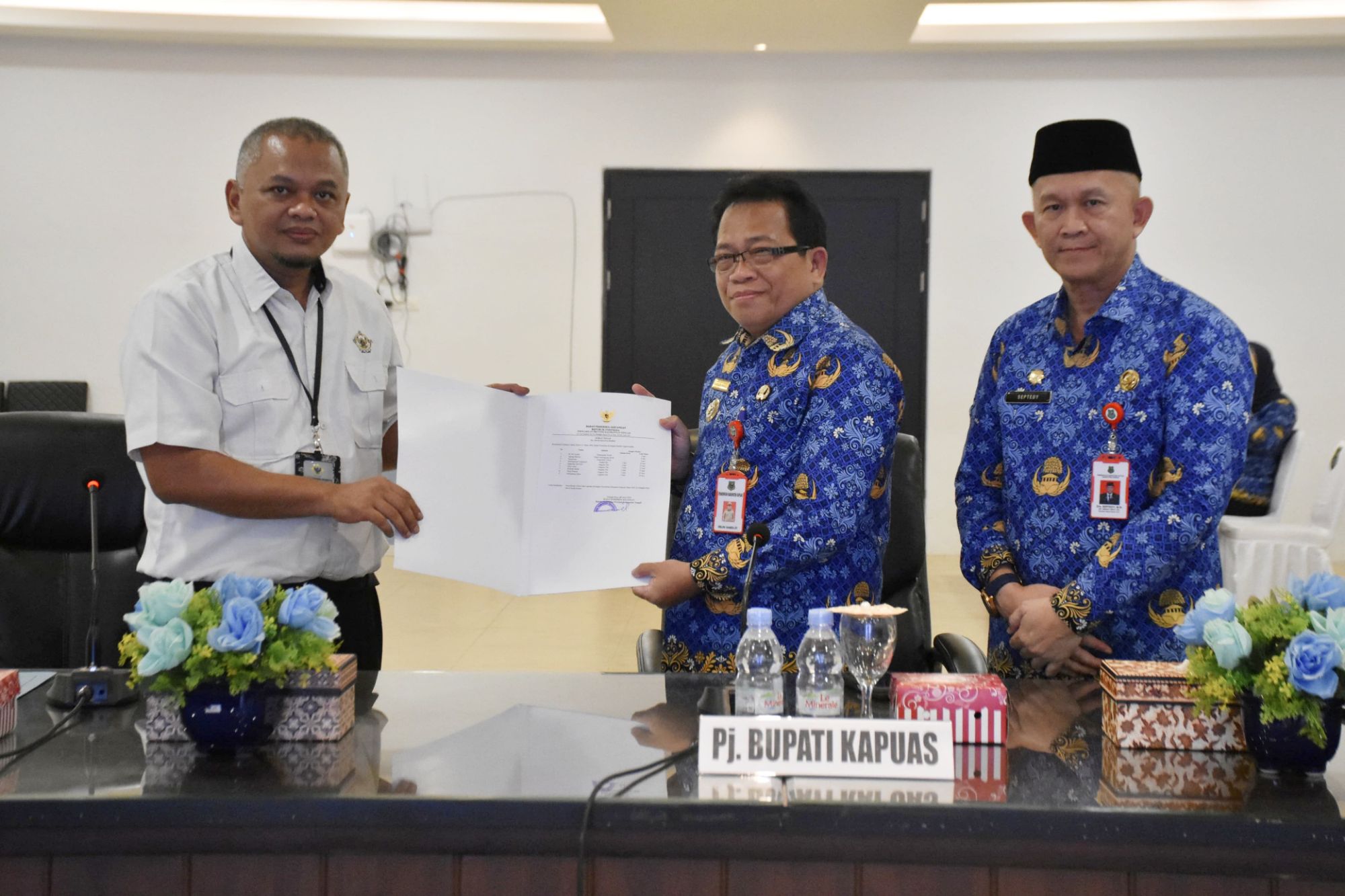 Pj Bupati Kapuas, Erlin Hardi, didampingi Sekda, Septedy, saat penyerahan Surat Tugas dari BPK RI Perwakilan Kalteng kepada Pemkab Kapuas, di Aula Rujab Bupati, Rabu (17/4/2024). POSBORNEO.COM, KUALAK...