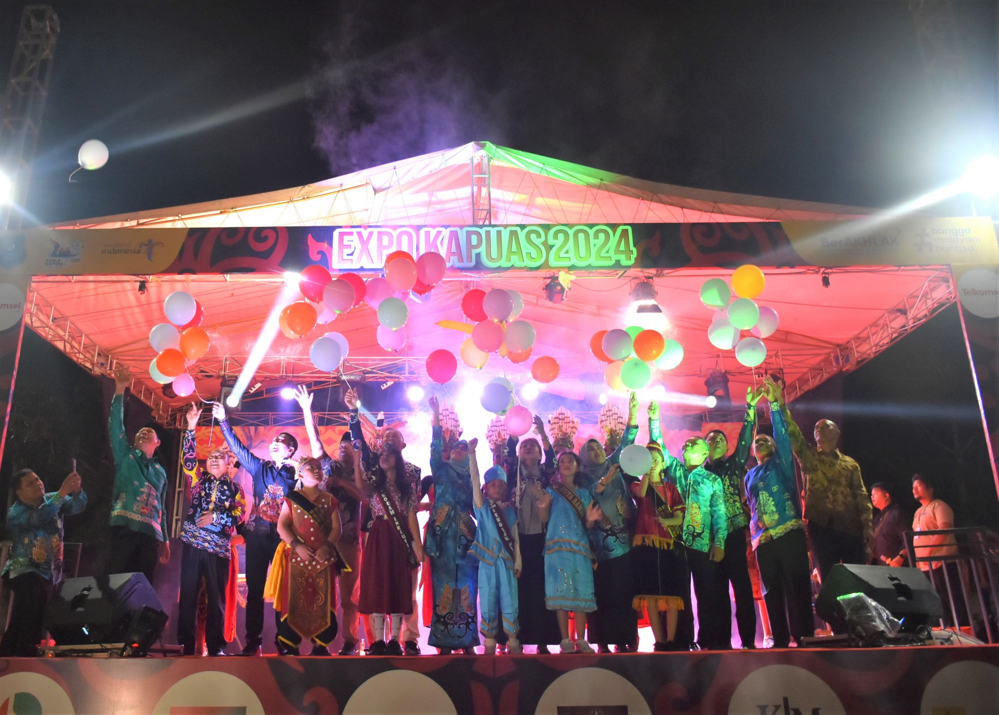 Sekda Kapuas Septedy bersama Pj Ketua TP PKK Kapuas Agustina Erlin Hardi dan Ketua DWP Kapuas Apollonia Septedy serta para tamu undangan melepaskan balon pertanda telah dimulainya Expo Kapuas 2024, Sa...
