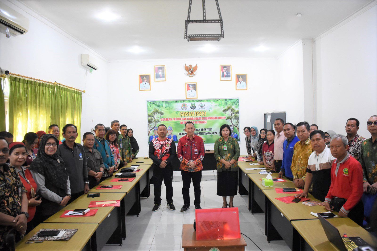 Sekda Kapuas Septedy berfoto bersama usai membuka sosialisasi Program Gerakan Peduli dan Berbudaya Lingkungan Hidup di Sekolah dan Penghargaan Adiwiyata (PGBLHS), bertempat di Aula DLH Kapuas, Jumat (...