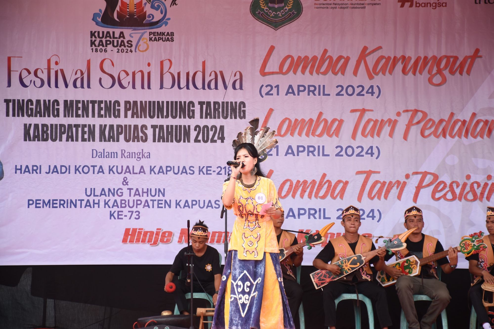 Penampilan Salah satu peserta lomba karungut kategori putri dalam rangkaian Kegiatan Festival Seni Budaya Tingang Menteng Panunjung Tarung Kabupaten Kapuas tahun 2024 di Lapangan Bukit Ngalangkang Kap...