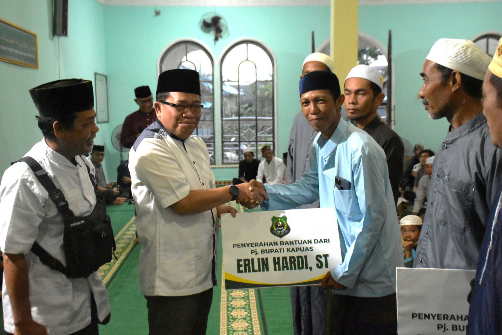 Pj Bupati Kapuas Erlin Hardi menyerahkan bantuan secara simbolis, pada kegiatan Safari Ramadhan 1445 H Pemerintah Kabupaten Kapuas di Masjid Al-Mubarak, Kelurahan Pulau Kupang, Kecamatan Bataguh, Sela...
