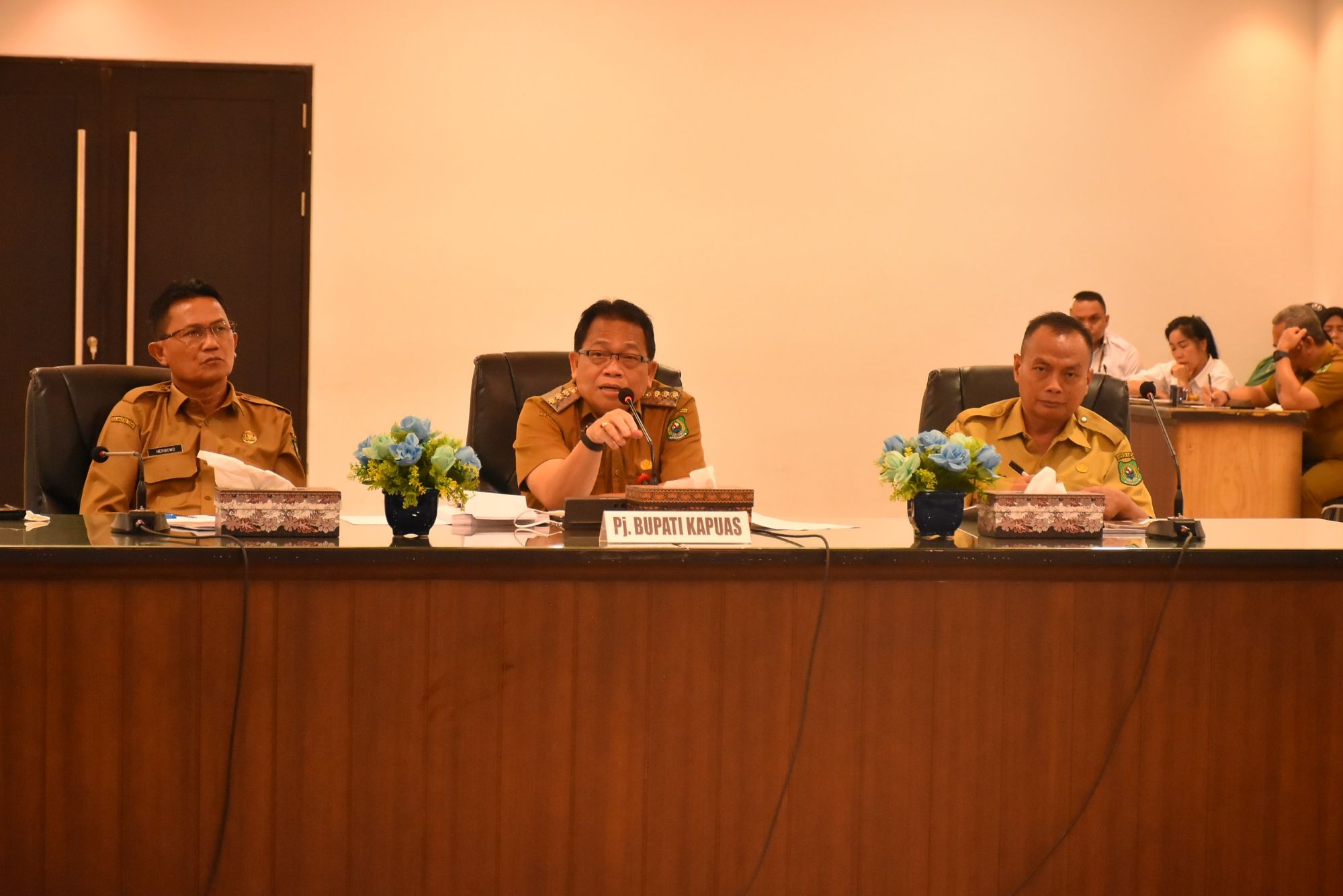 Pj Bupati Kapuas Erlin Hardi saat mengikuti Rapat Asistensi Penyusunan Laporan Evaluasi Kinerja Triwulan II oleh Inspektorat Jendral (Itjen) Kementrian Dalam Negeri (Kemendagri) melalui Zoom Meeting b...