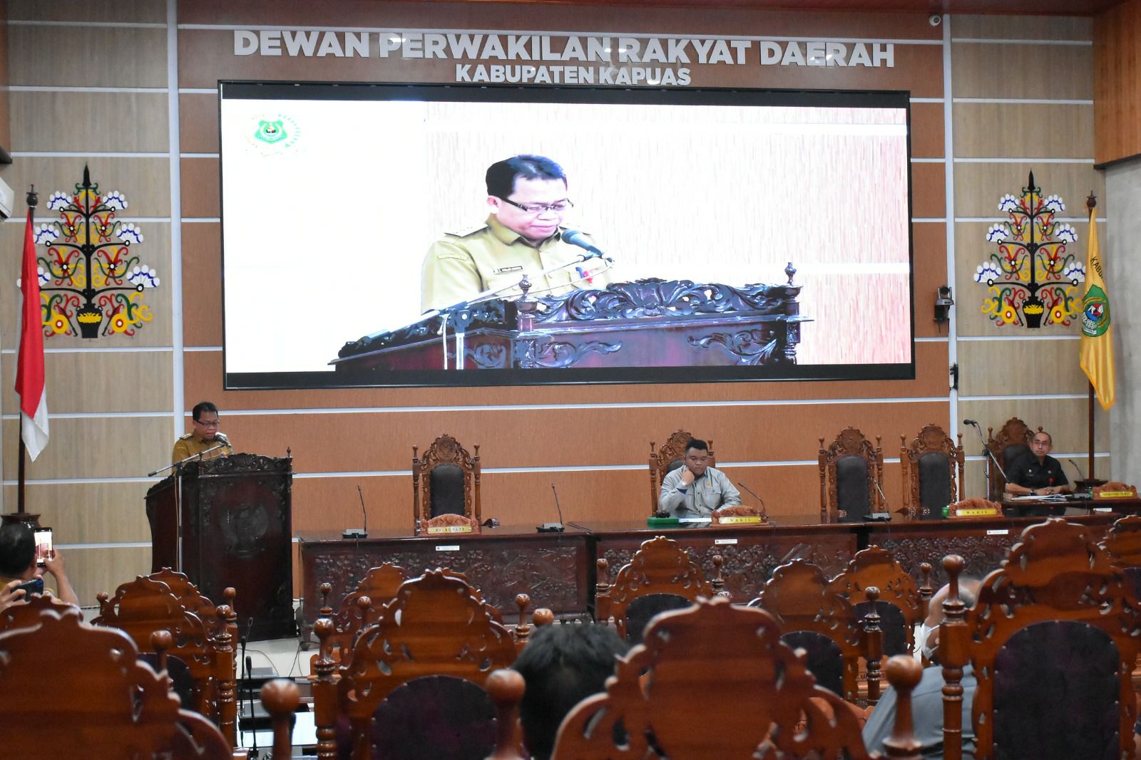 Pj Bupati Kapuas Erlin Hardi menyerahkan LKPj Bupati Kapuas tahun anggaran 2023 kepada Wakil Ketua II DPRD Kapuas Evan Rahman Saputra pada Rapat Paripurna ke 4 masa persidangan II tahun sidang 2024, S...