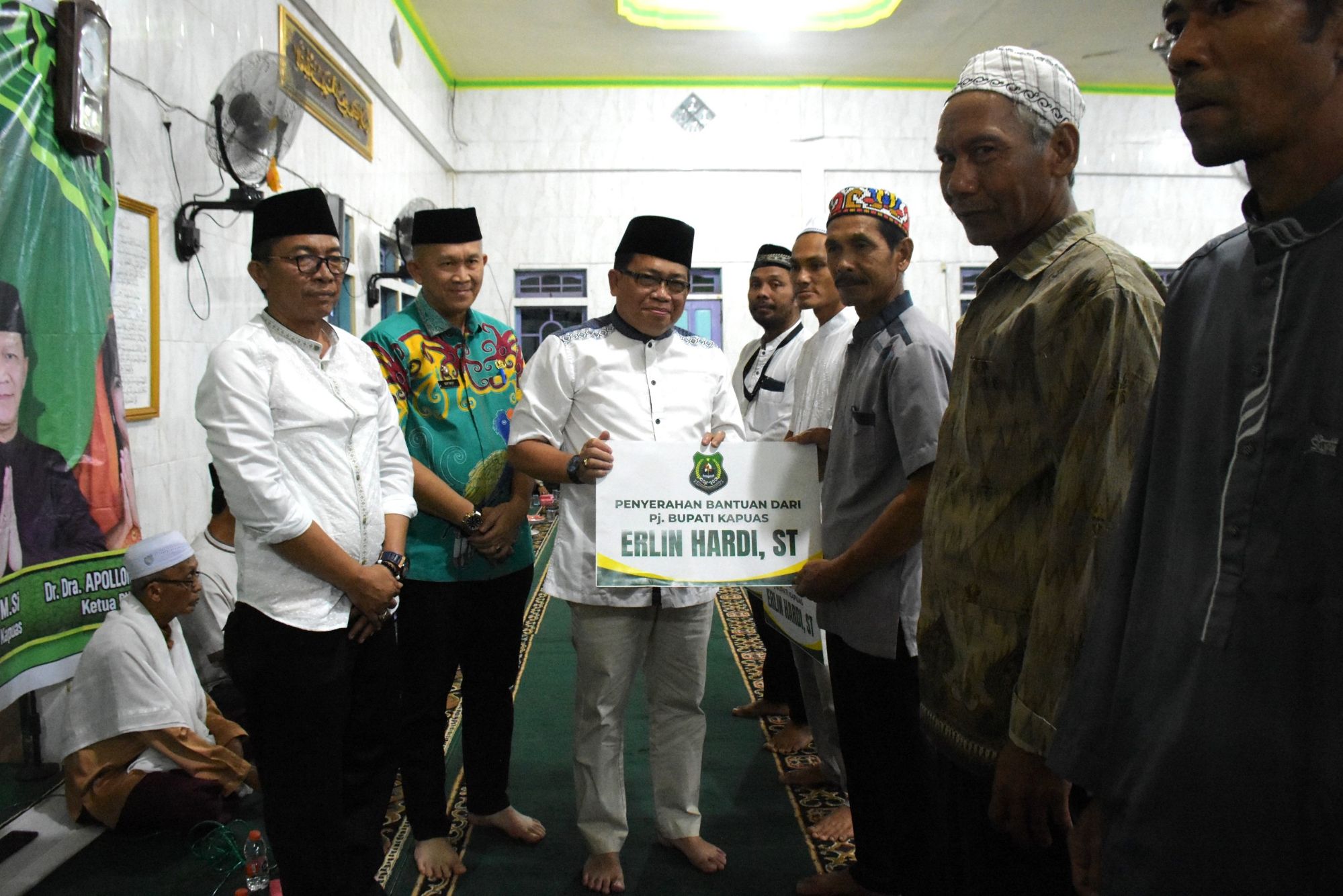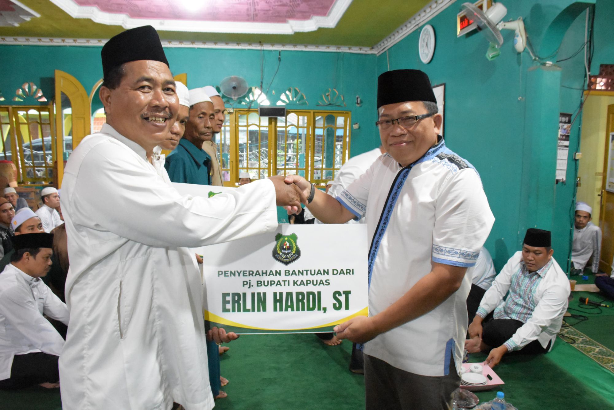 Pj Bupati Kapuas Erlin Hardi saat menyerahkan bantuan secara simbolis, pada kegiatan Safari Ramadhan 1445 H Pemerintah Kabupaten Kapuas di Masjid Amanul Ikhsan, Desa Sei Tatas Hilir, Kecamatan Pulau P...
