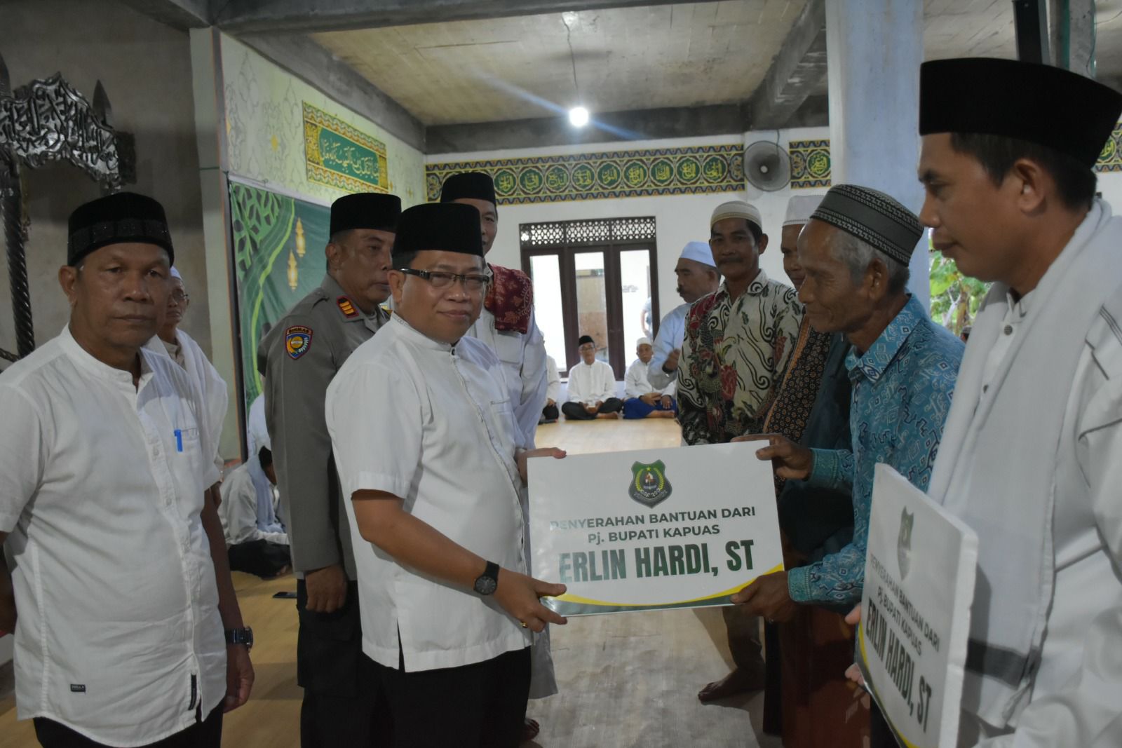 Pj Bupati Kapuas Erlin Hardi saat menyerahkan bantuan secara simbolis, pada kegiatan Safari Ramadhan 1445 H Pemerintah Kabupaten Kapuas di Masjid Nor At-Taqwa, Desa Bungai Jaya Kecamatan Basarang, Sel...