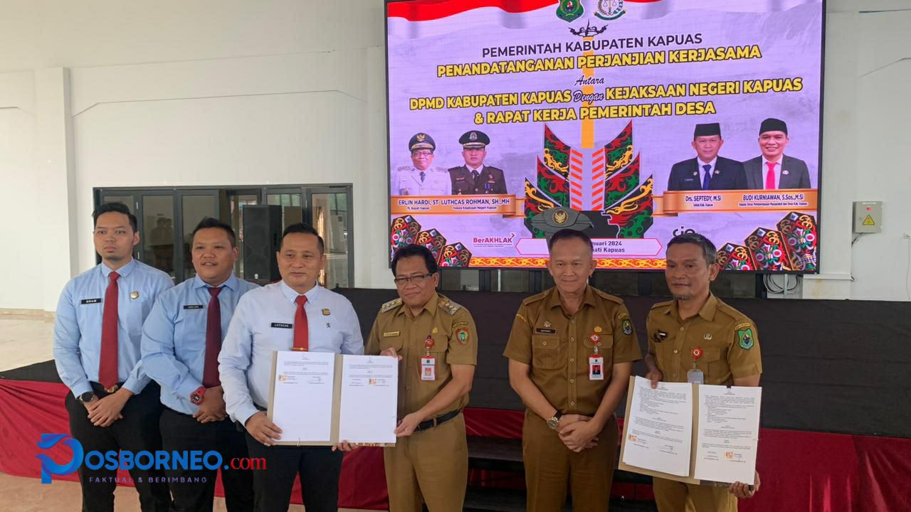 Pj Bupati Kapuas Erlin Hardi saat penyerahan naskah penandatanganan perjanjian kerja sama antara DPMD dengan Kejari Kapuas dan rapat kerja pemerintah desa di Hall Rumah Jabatan Bupati Kapuas, Selasa (...